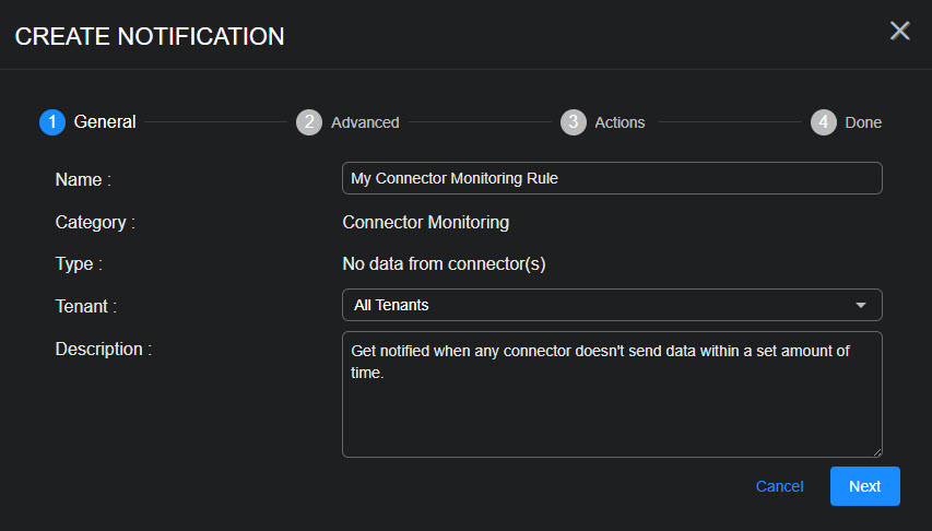 | Connector Monitoring | No data from connector(s) | Get notified when any connector doesn't send data within a set amount of time. | Enabled |