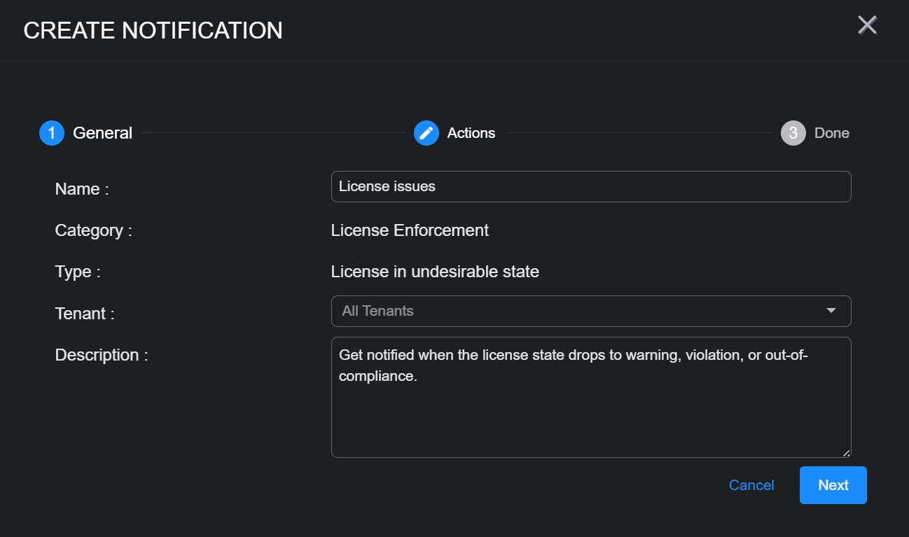 | License Enforcement | License in undesirable state | Get notified when the license state drops to warning violation or out-of-compliance. | Enabled |