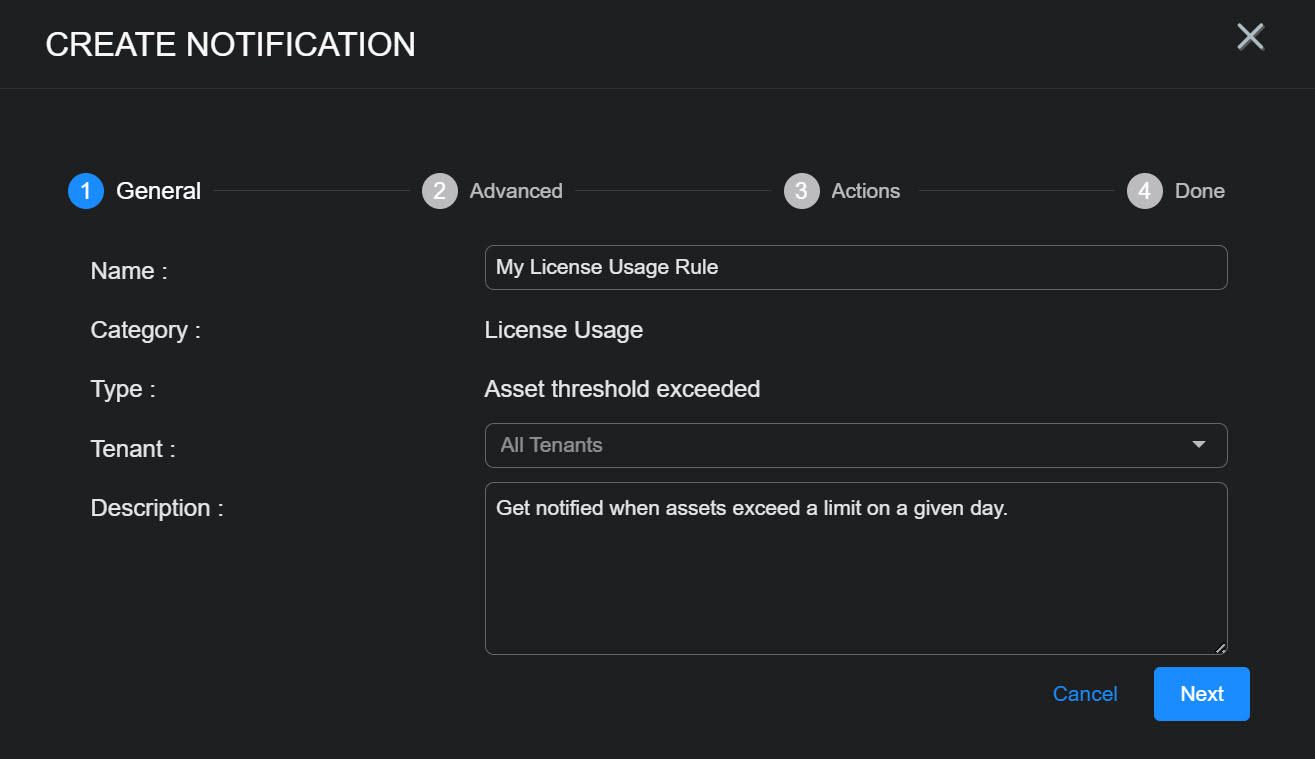 | License Usage | Asset threshold exceeded | Get notified when assets exceed a limit on a given day. | Enabled |