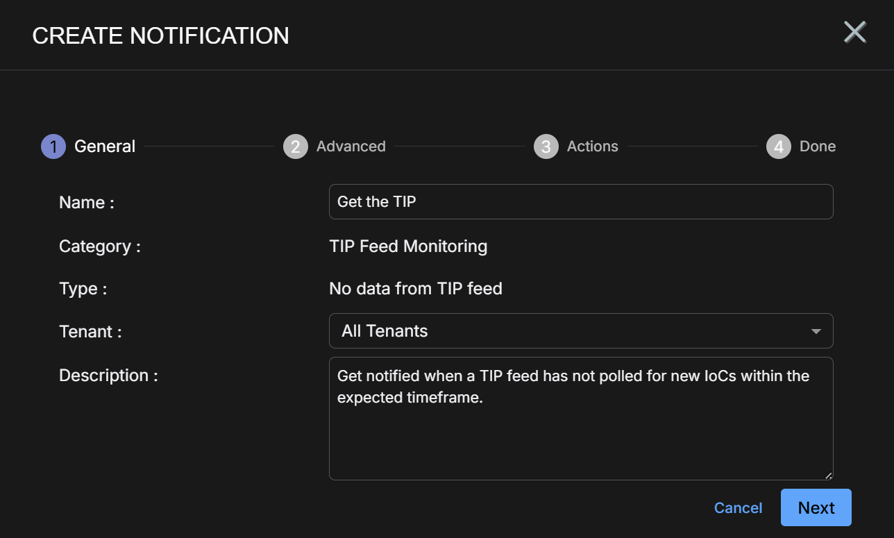 TIP Feed Monitoring rules help you keep tabs on the status of your configured TIP feeds. You can create the following types of TIP Feed Monitoring rules: