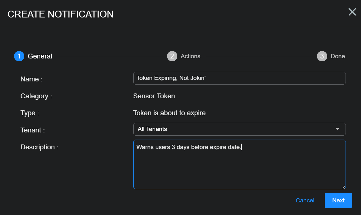 Sensor Token rules notify you three days before a token is about to expire. Tokens are used to authorize sensor installations.