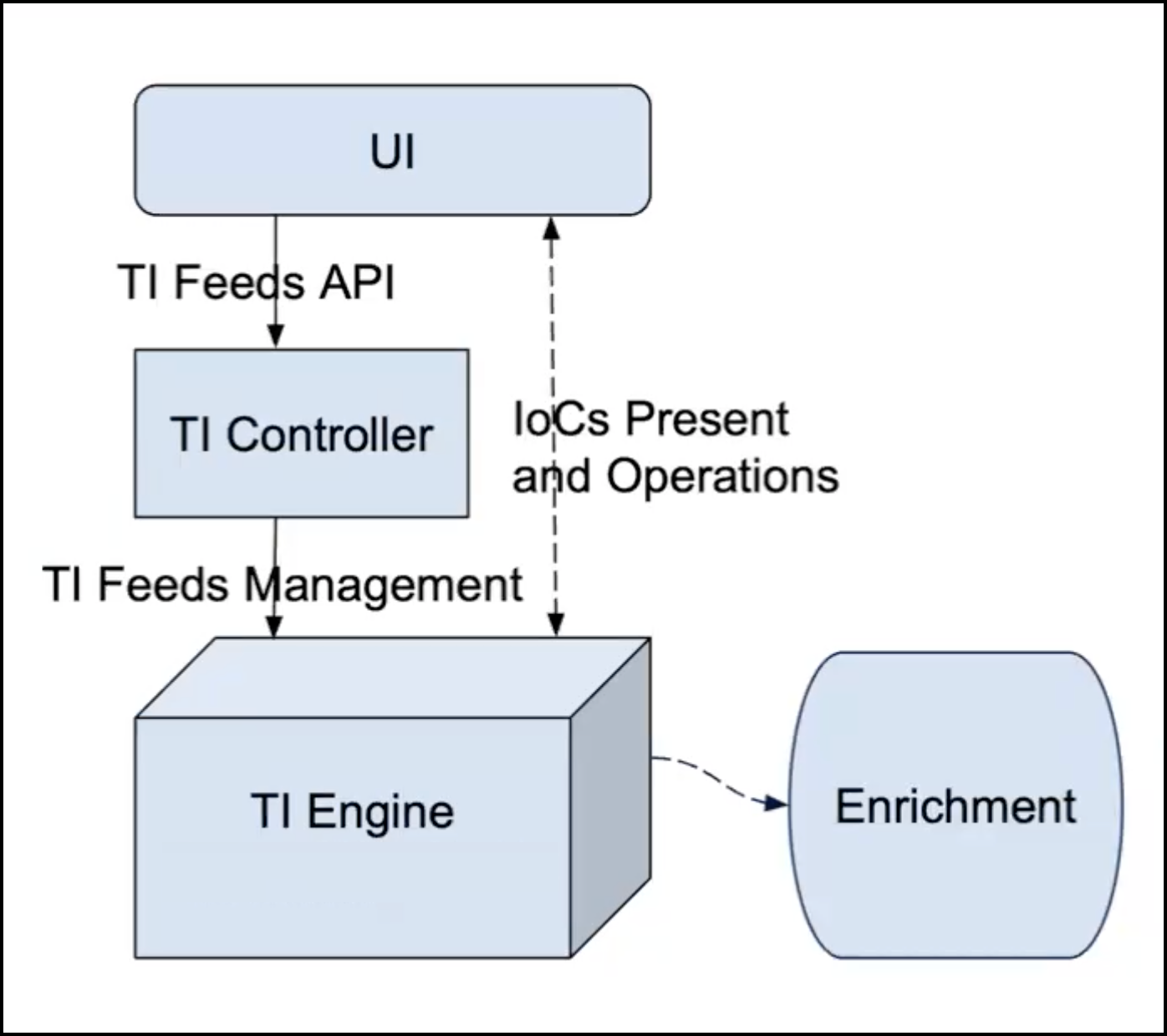 The following simplified architecture diagram shows the user interface (UI), Threat Intelligence (TI) Controller, and TI Engine.