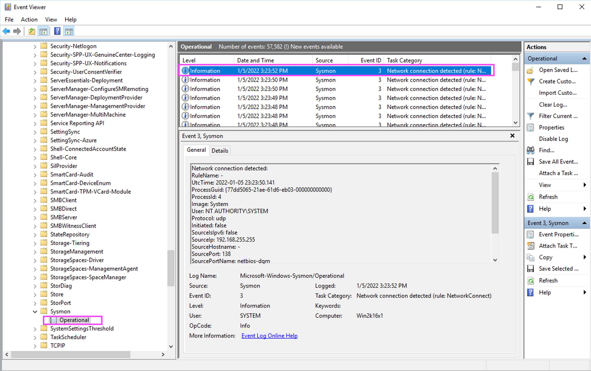 Verify that Network connection detected (Event ID 3) events appear in the list as highlighted in the figure below: