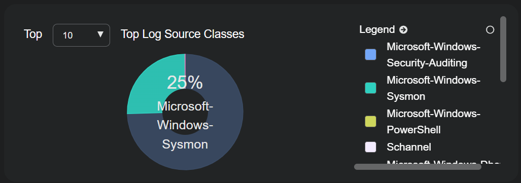 Locate the Top Log Source Classes panel and verify that it includes Microsoft-Windows-Sysmon, as in the figure below: