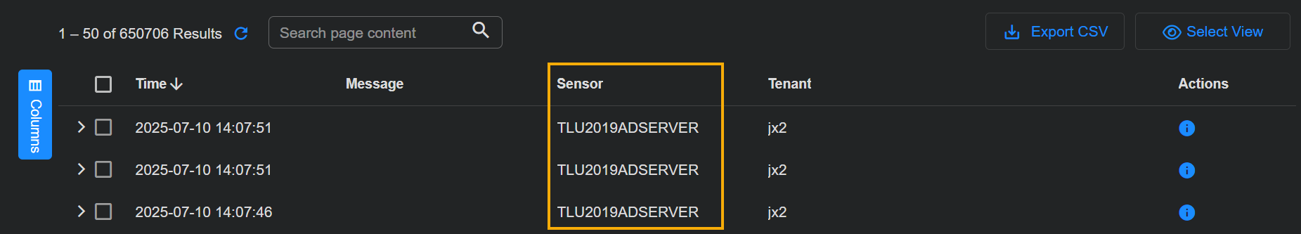 Sort by the Sensor column and scroll to the entries for the sensor you identified at the start of this procedure to verify that it passes the Sysmon filter. For example: