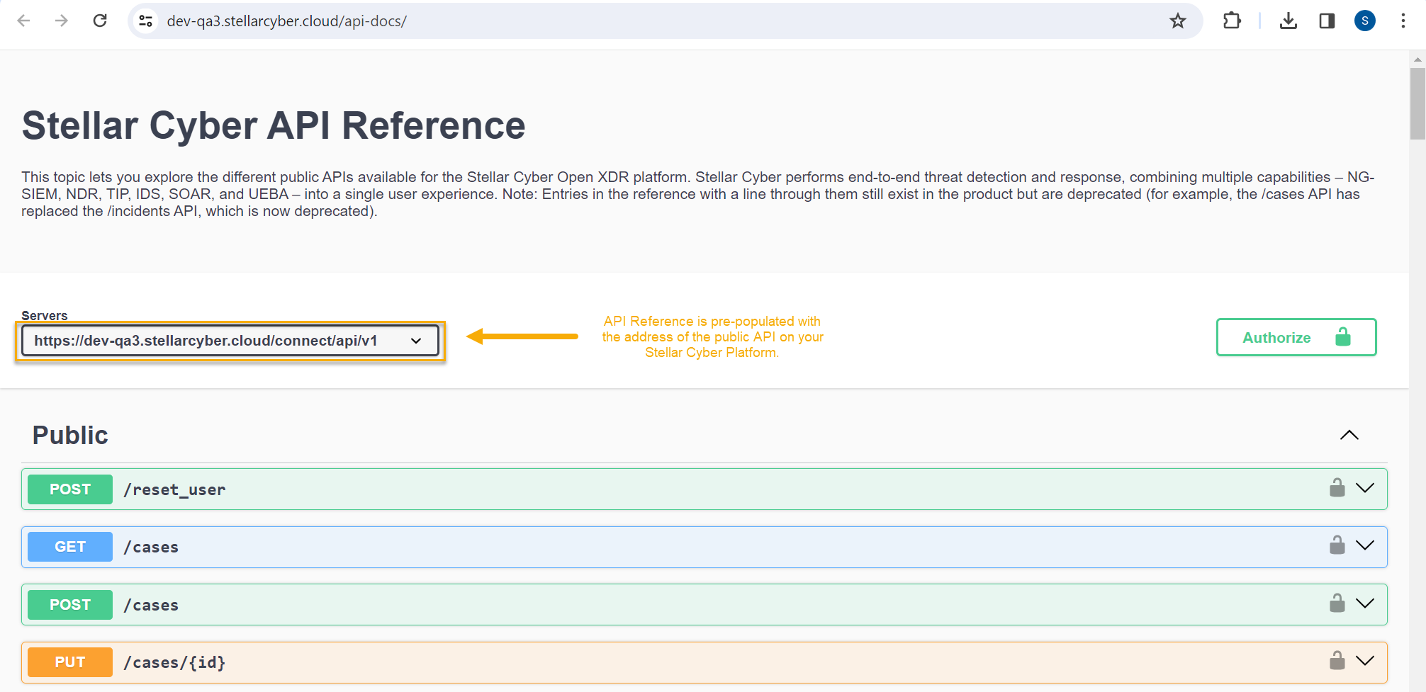 In response, a new browser tab appears with an interactive Swagger reference pre-populated to use the API on your Stellar Cyber Platform.