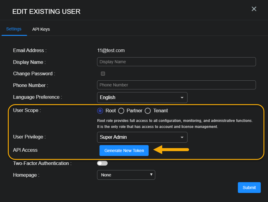 User with a Scope of root and a User Privilege of Super Admin can also use the Generate Token button in the API Access section of the Edit User dialog box to generate an API token.