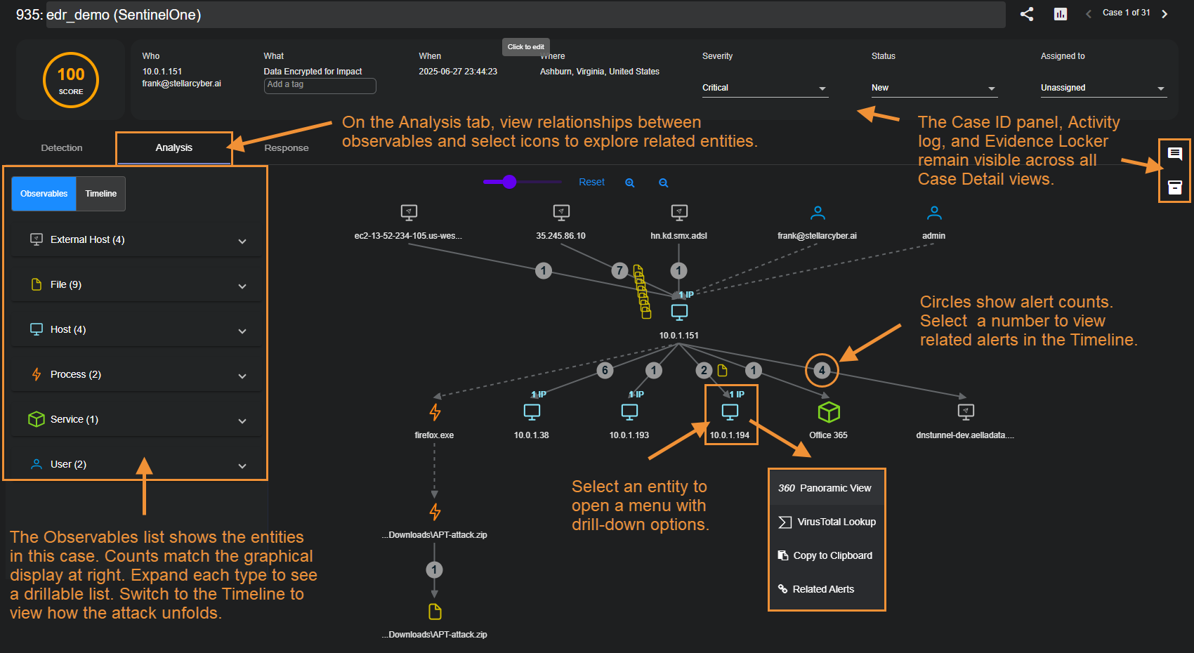 The Analysis tab provide multiple options for contextual drill-down to further analysis elsewhere in Stellar Cyber: