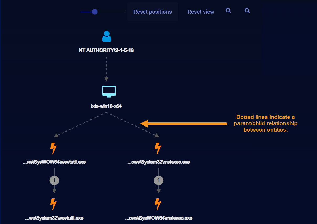 The Analysis workspace represents events taking place between different entities with solid lines, while dotted lines represent parent/child relationships. For example, the dotted lines in the figure below indicate a parent/child relationship between a host and a process: