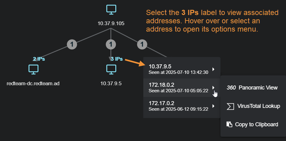 When Stellar Cyber detects multiple IP addresses on the same host, it displays a short message indicating the number of associated IP addresses. You can select the message to see a pop-up listing each of the detected IP addresses, including a timestamp of when it was seen and drill-downs for further analysis. The illustration below provides an example of a host with multiple associated IP addresses.