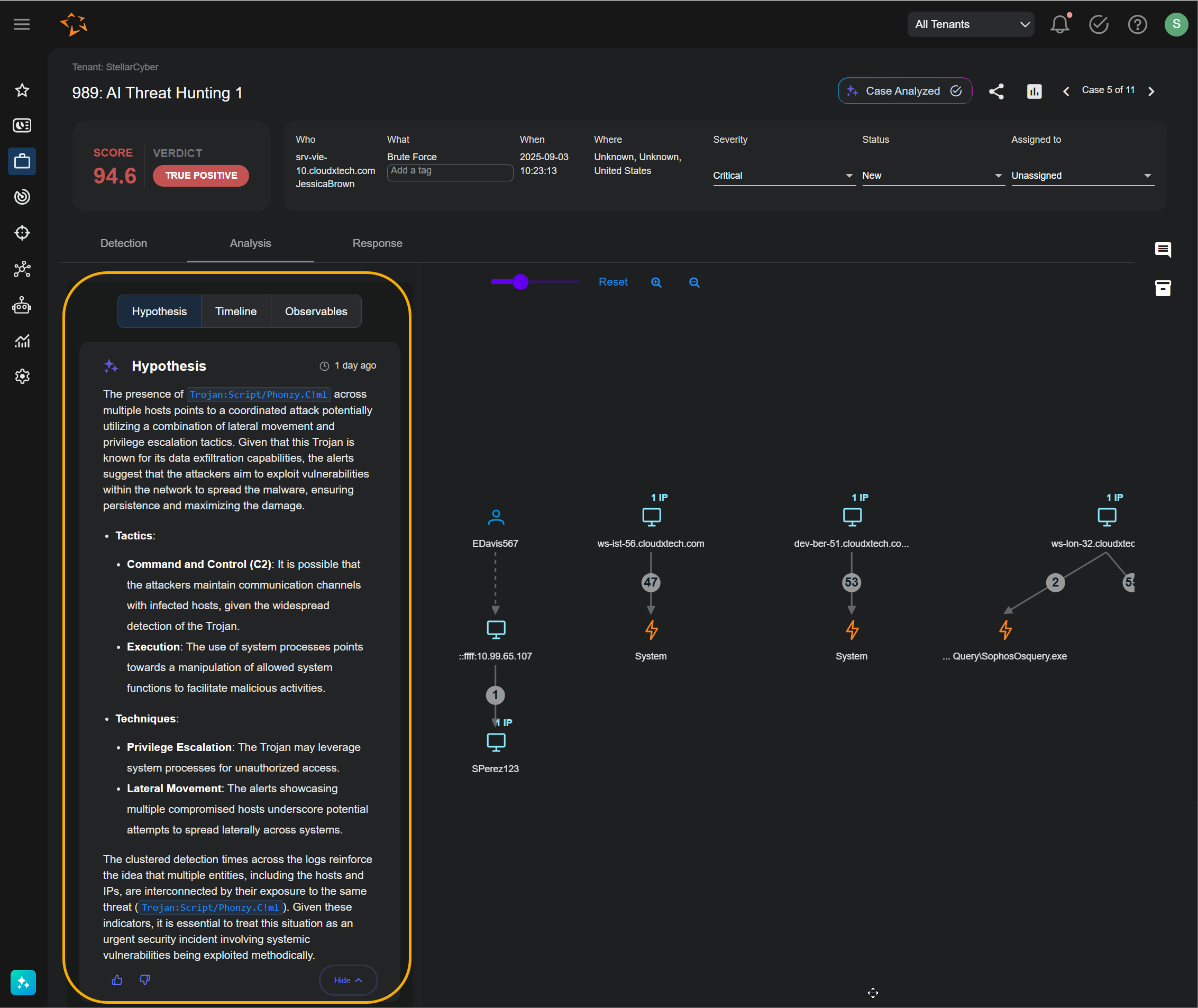 Hypothesis panel – This entirely new panel provides an analyst-style narrative that explains what likely occurred, connecting multiple alerts into a storyline. For example, brute force → reconnaissance → exploitation → insider-like activity. The Hypothesis tab also maps to MITRE ATT&CK tactics and techniques, as you can see in the figure below: