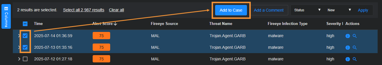 You can add alerts to a case manually from the Alert Details page. Select Detections | Alerts | View for an alert type, select one or more alerts in the table, and then select Add to Case to either create a new case or fadd them to an existing case.
