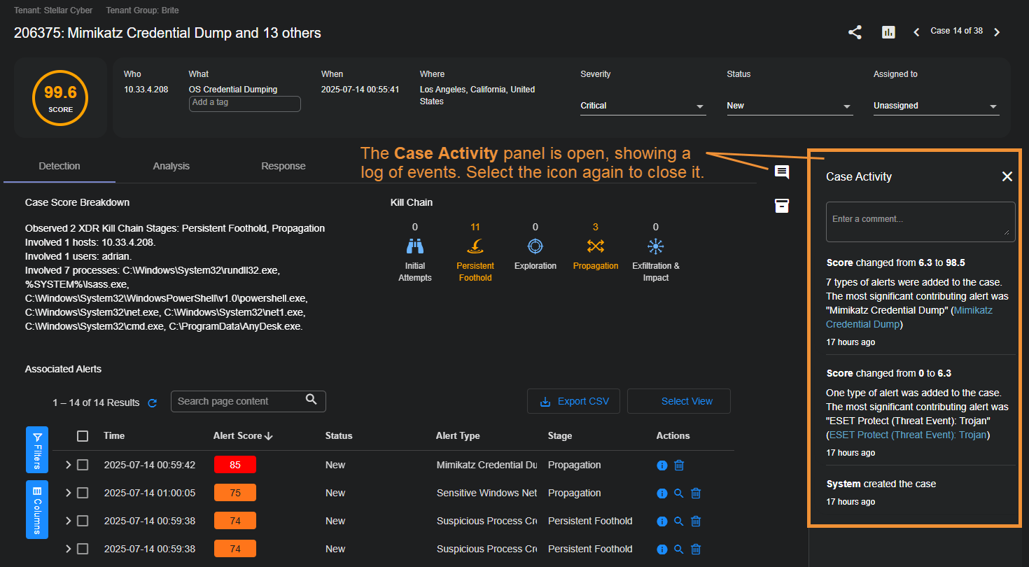 • Case Activity – The Case Activity panel provides an audit trail for the case, chronicling any changes made to its associated alerts, Score, Severity, Status, Resolution, Assignee, Tags, or Description, in addition to any synchronization events with third-party applications such as ServiceNow via a Stellar Cyber InSync. You can also add your own comments to the Case Activity panel, helping you annotate changes made during the investigation of a case. Comments are viewable by all users, but can only be edited or deleted by the user who created them. Changes to comments also correspondingly update the Last Modified date for the case.
