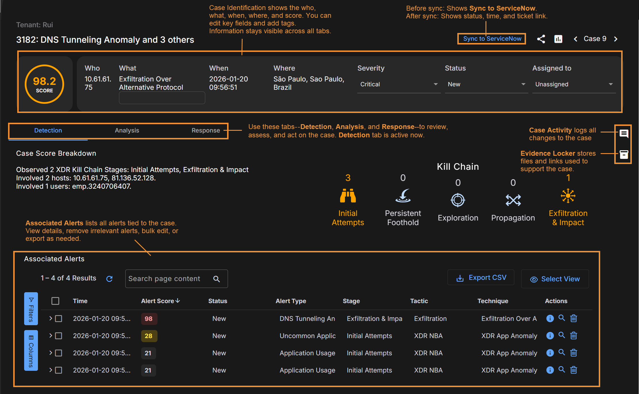 • Detection Tab – The Detection tab provides a high-level summary of the case, including a breakdown of what Stellar Cyber has seen and why it is scoring the case the way it is. You can also see a summary of the XDR Kill Chain stages involved, and a table of Associated Alerts.