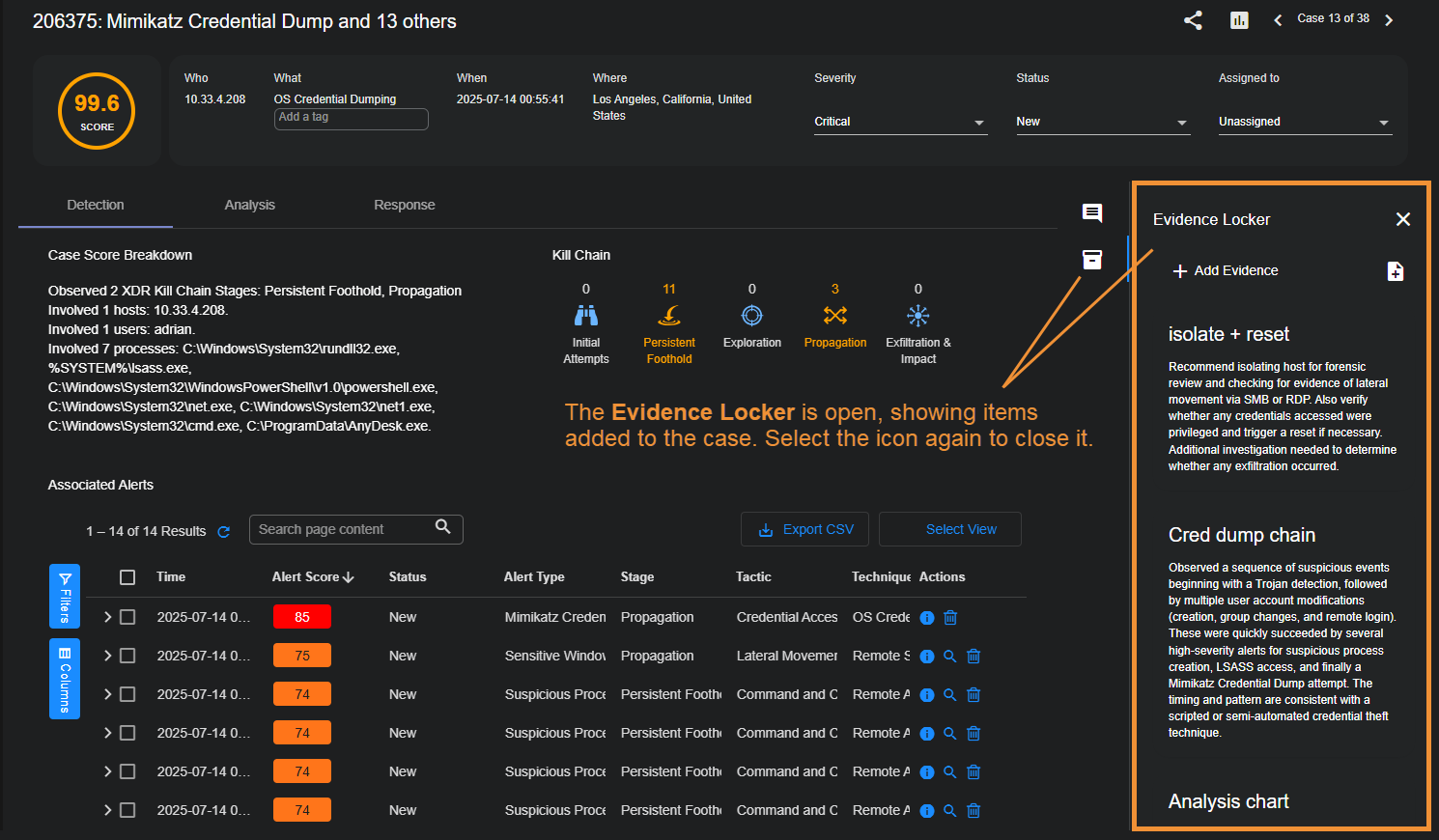 Open the Evidence Locker by selecting its button at the far right of the Case Detail view. Similar to the Case Activity panel, the Evidence Locker is available in all Case Detail views, regardless of the currently displayed tab.