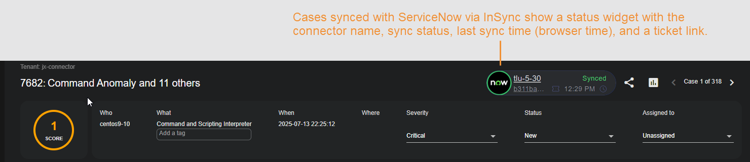Cases synchronized with a third-party application such as ServiceNow using a Stellar Cyber InSync include a status indicator for the InSync at the top of the Case Identification panel, as illustrated below.
