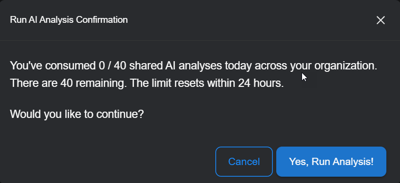 A confirmation prompt appears, informing you of your organization's remaining daily AI analyses. Click the Yes button to begin AI Case Analysis.