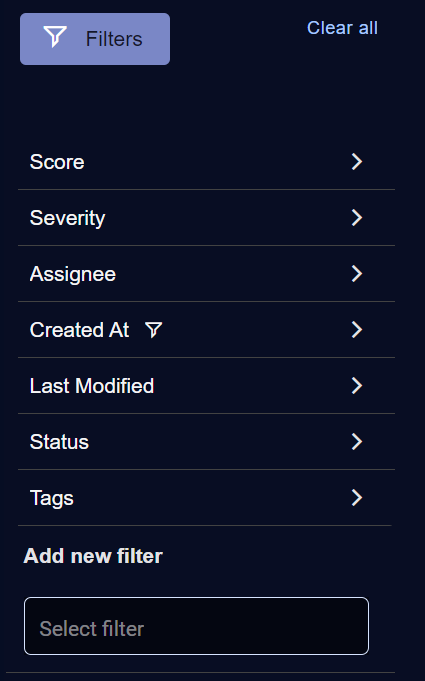 The Cases page includes a Filters panel that lets you focus the display on just those cases matching the criteria you supply. By default, you can filter the Cases page by Score, Severity, Assignee, Created At date, Last Modified date, Status, or Tags. You can also use the Add new filter feature to add filters based on the same criteria available as columns for the Current Cases table.