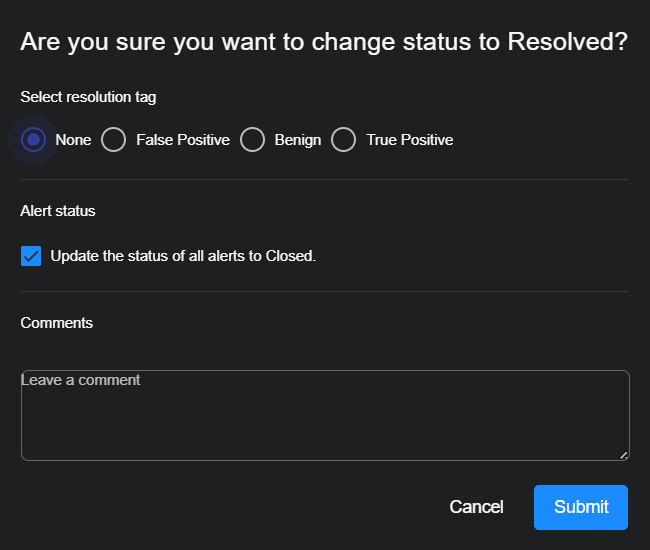 Resolution – The resolution given to a case when its status was set to Resolved. Resolutions can be None, False Positive, Benign, or True Positive. The default is None. See Suggested Usage for the Case Resolution Tags for more information on the available resolution tags.
