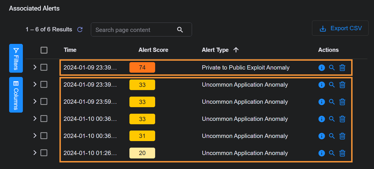 There are five different Uncommon Application Anomaly alerts associated with the case. As you can see in the table, the highest Alert Score across those five alerts is 33, which is the value Stellar Cyber uses to calculate the score. Similarly, it also takes the highest Severity and Fidelity score across these five alerts.