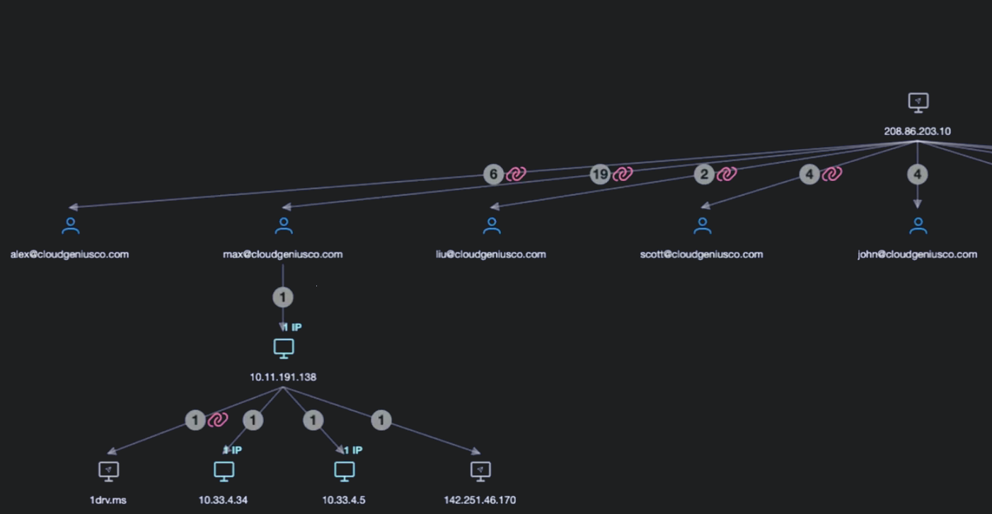 The figure below provides an example of multi-entity correlation in action, with both hosts and users in the same case graph: