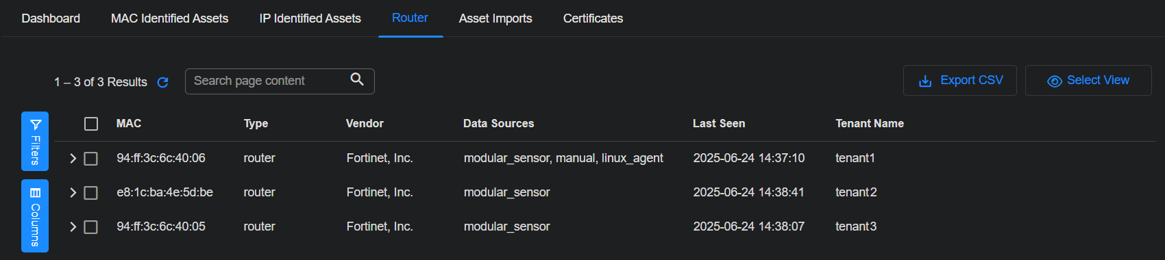 The assets are immediately marked as routers and removed from the assets table. They appear in the Router tab.