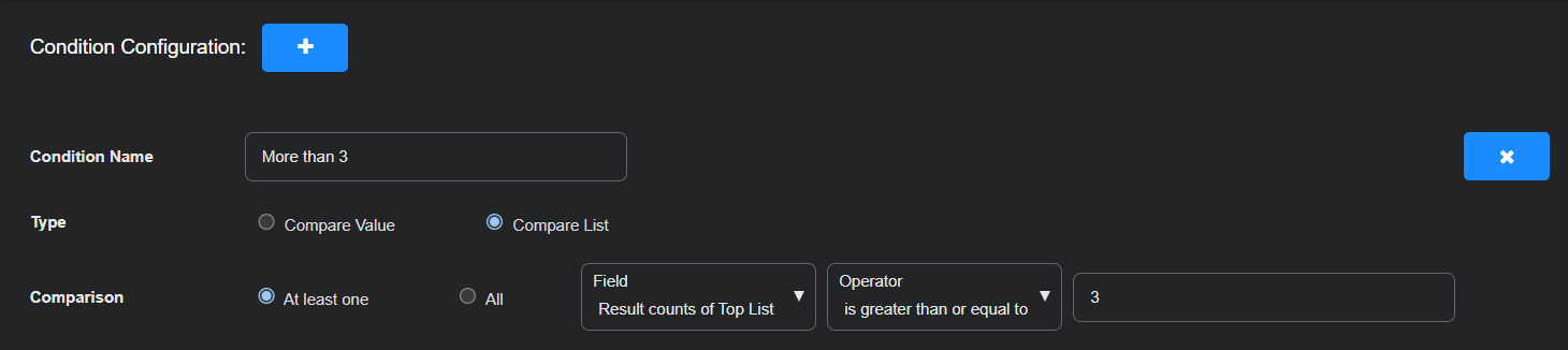 Comparison: At least one, Result counts of Top List, is greater than or equal to, 3