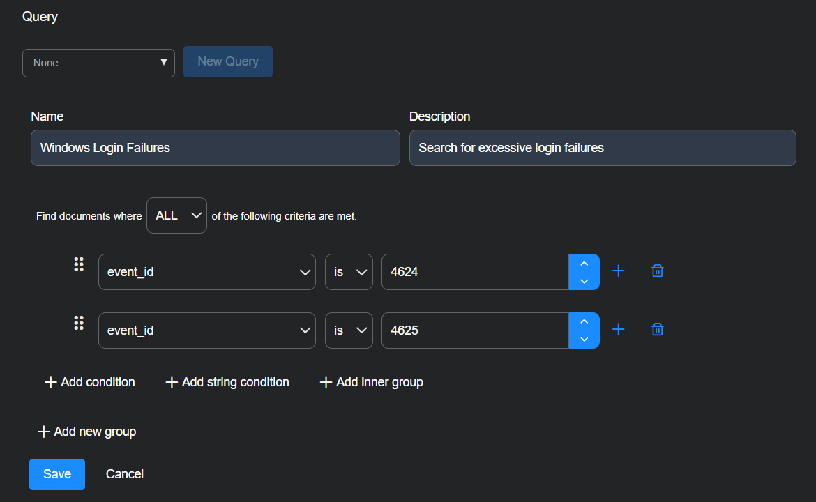 2 – Build detection logic   Create or load your query or correlation in the Query section.   See Build a Query or Build a Correlation.