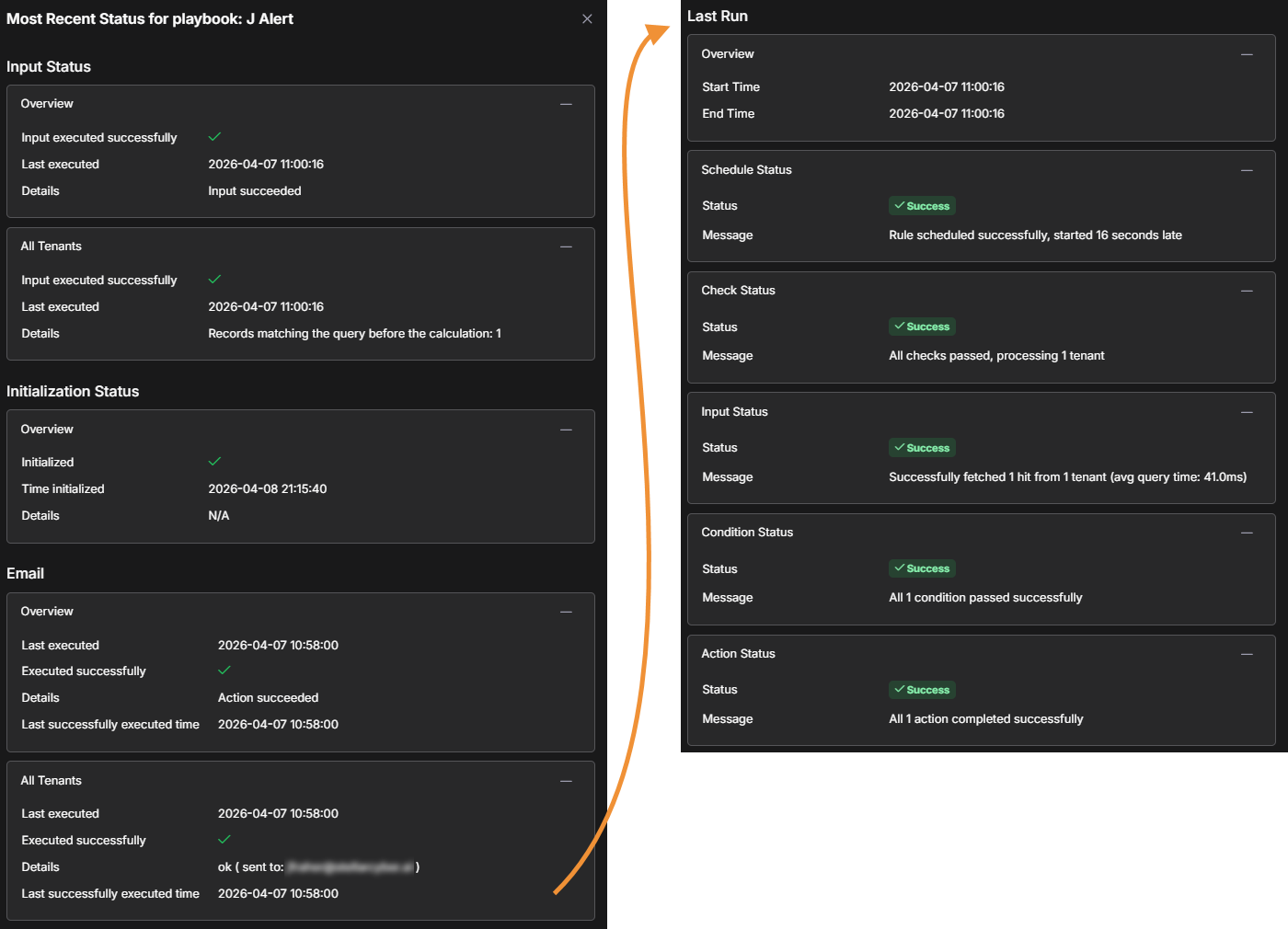 If the playbook runs on schedule but its condition is not met, the Action section does not update. In this case, it continues to display the results from the last time the playbook successfully triggered an action. For example, if the rule last triggered an alert yesterday but has since run several times without meeting its condition, the Last executed field in this section continues to show yesterday’s date. The Input Status section, however, updates each time the playbook runs.