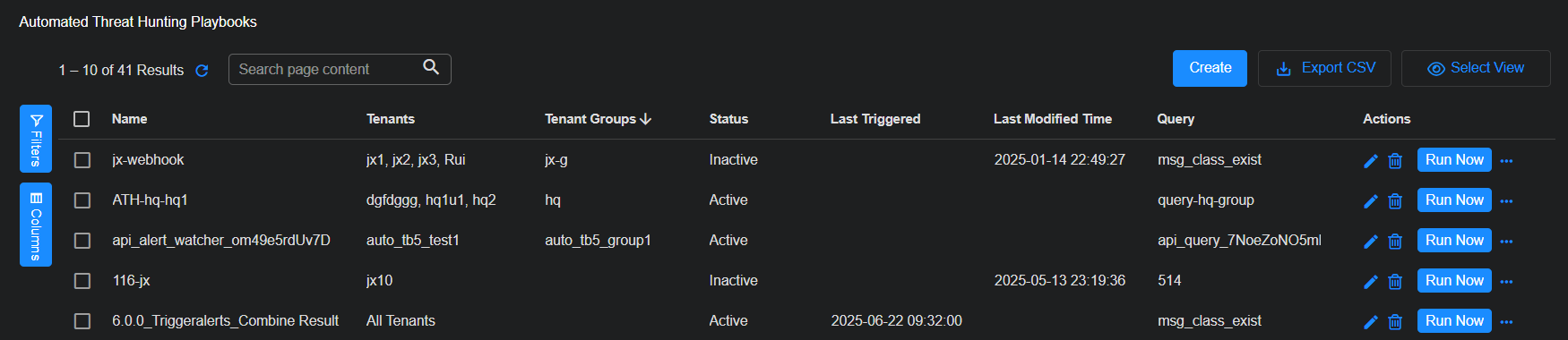 • Imported Playbooks: After import completes, review the imported playbooks to confirm that the tenant assignment, query logic, schedule, and configured actions are correct for the target environment before enabling them.