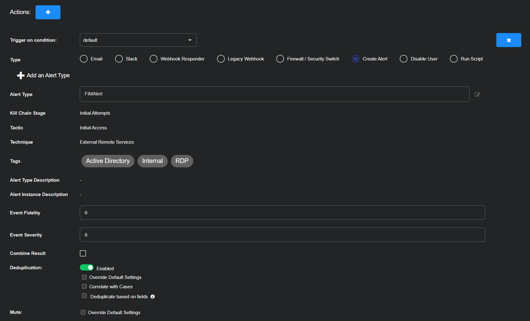 • Looked at another way, if you enable both Combine Result and Deduplication, then deduplication will only take place if the deduplication window is greater than the Run Every window. In this case, the deduplication window cover multiple iterations of the rule, meaning that there would potentially be multiple combined alerts in the deduplication window to be deduplicated.