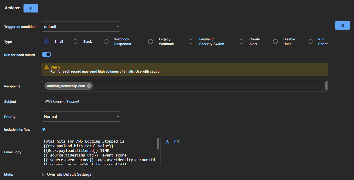 You can use the Mute feature in the Actions panel to temporarily halt specific individual actions associated with a playbook. Select Override Default Settings and toggle Mute | Disabled to Enabled. Then use the adjacent fields to specify for how long you would like to stop the action from triggering.