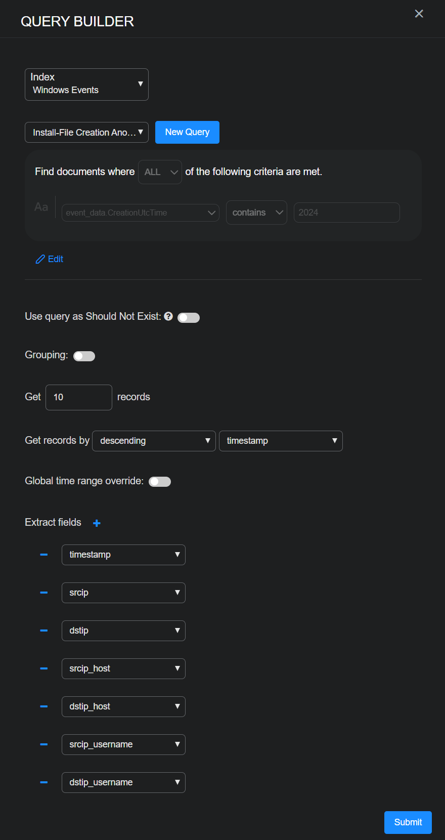 Stellar Cyber deduplicates custom alerts by discarding fields that are always different between separate alerts, calculating a hash, and monitoring future events for matches. Because the following fields are always different between separate records, they are not considered when calculating the hash used for deduplication: