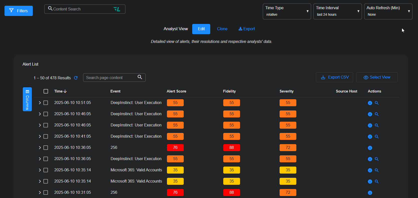 The Dashboards | PREDEFINED | Analyst View provides a simple table listing all of the events in a specified time frame. It provides a simple view to make it easy for you to focus on the events that are important to you.